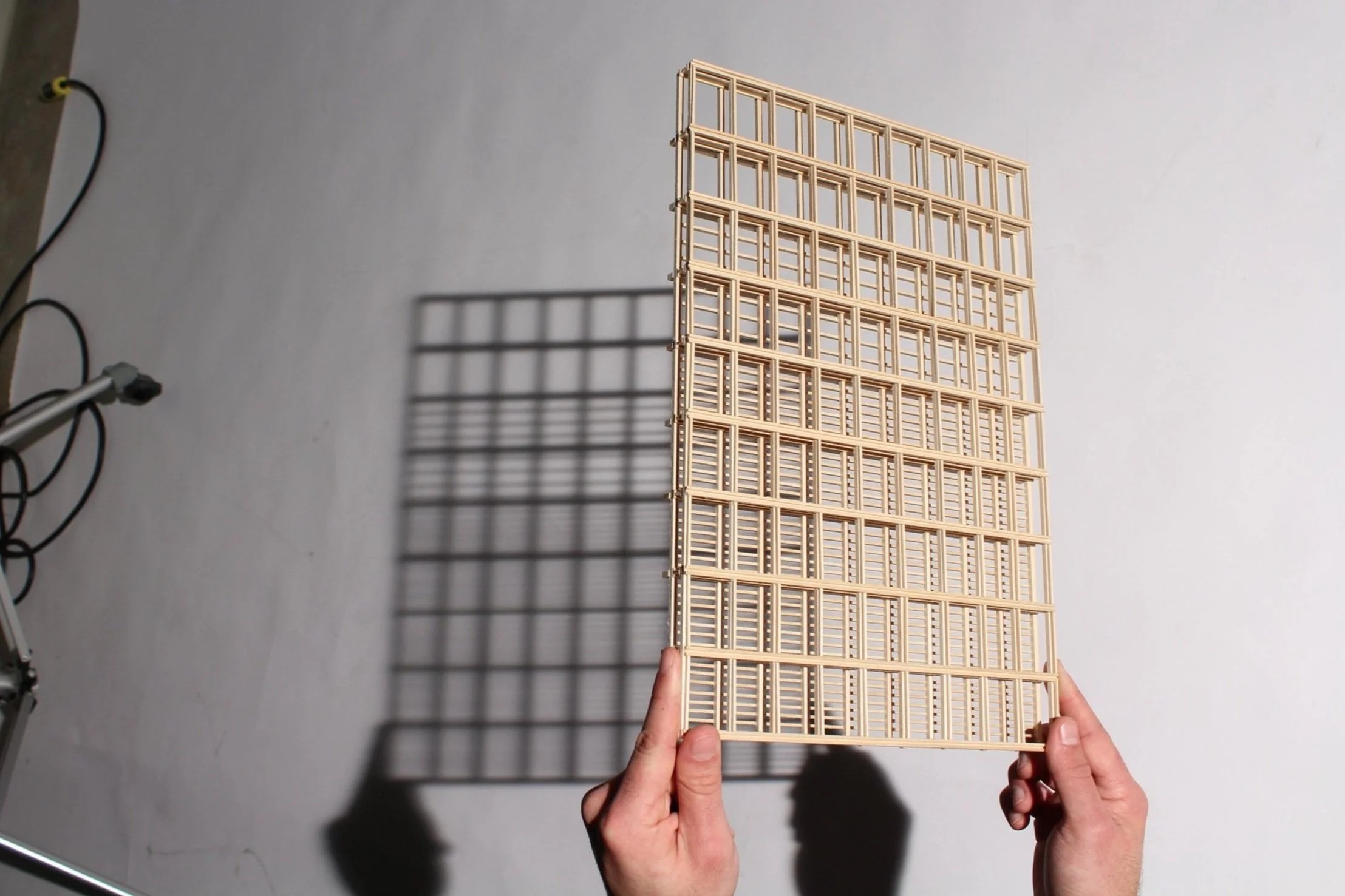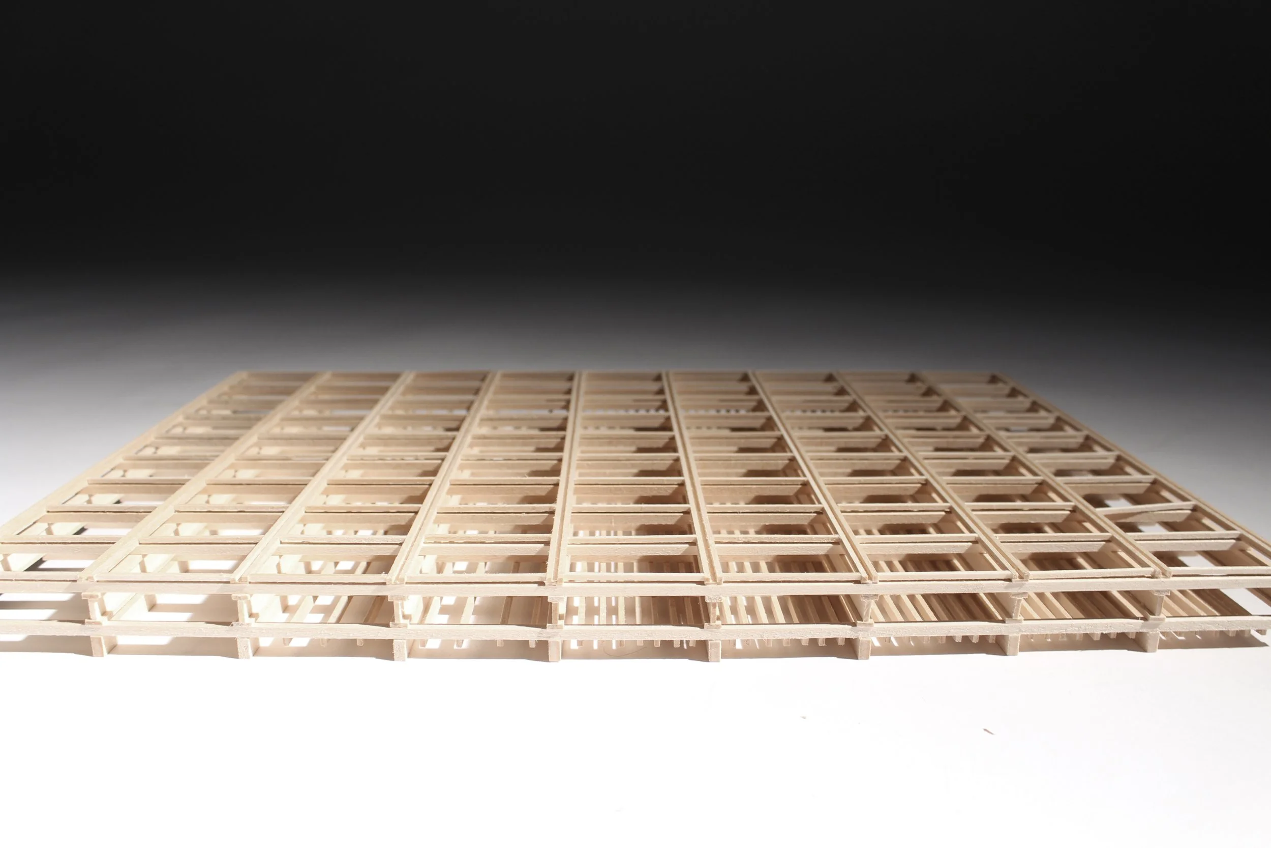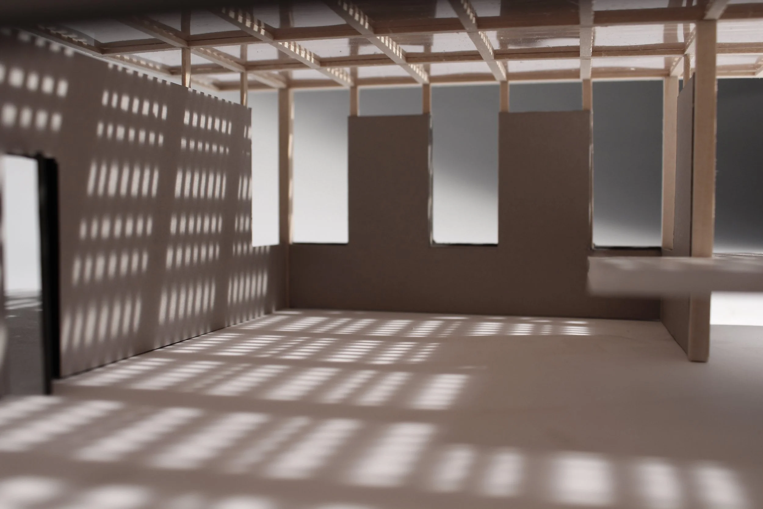 The louvers come into play to control the atmosphere and lighting. They can diffuse the light when desired, or be opened to allow the streaks of light to shine through. This would be most beneficial to a painter who would not want direct sunlight on their work, especially while they were painting, but would allow that same person to appreciate the other aspects of light allowed into their home. This way they have complete control over the consistency of light desired. I built a scale model of the roofing system to test various louver spacing and light filtration. The grid of the skylight system was then used to inform the modular system of the house layout. By bringing in natural light from the roof system and clearstory windows allows for space on the walls to be used as creative work space without distraction and control of the light can be adjusted to the needs of the work and comfort of the artist.