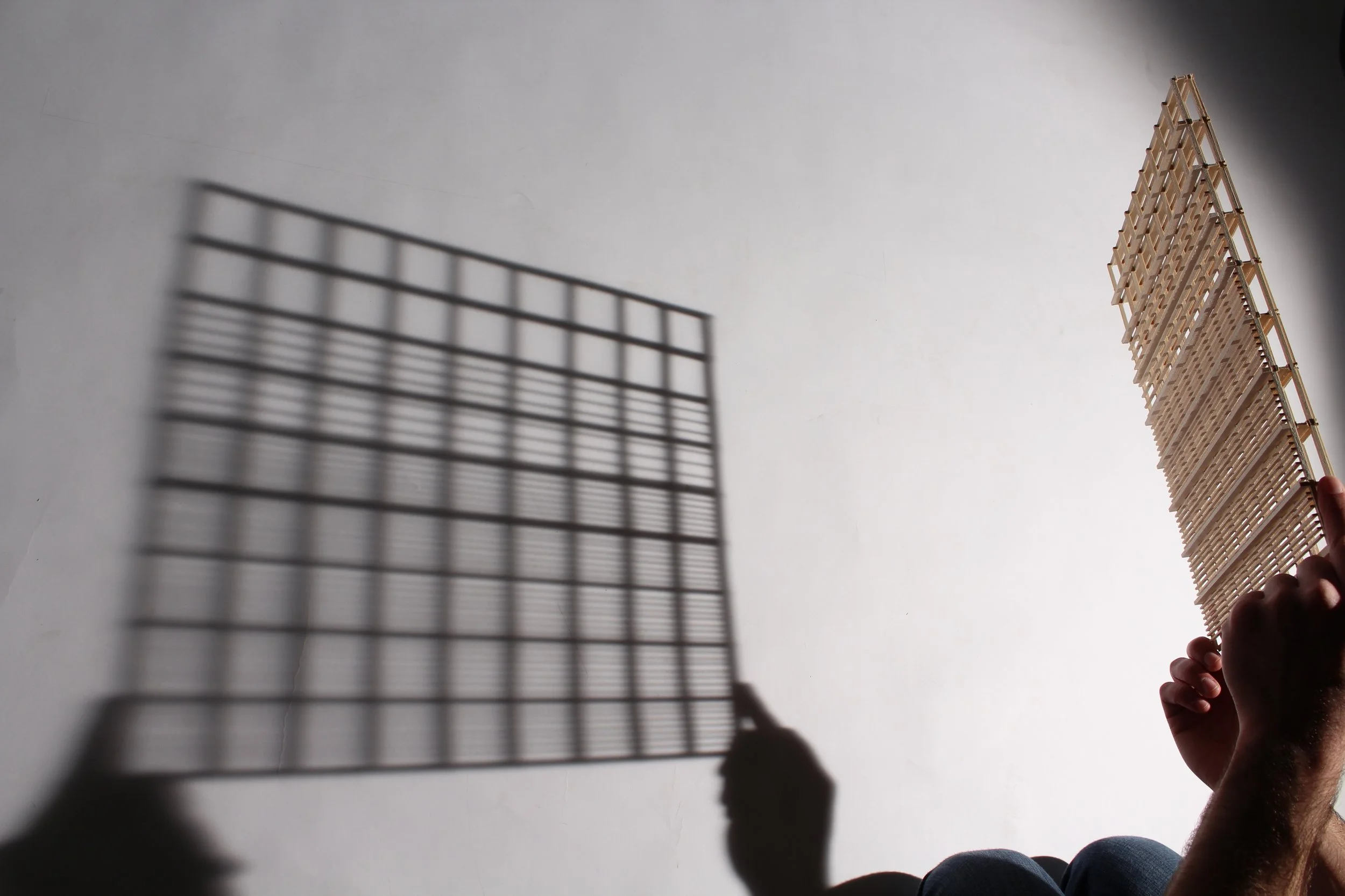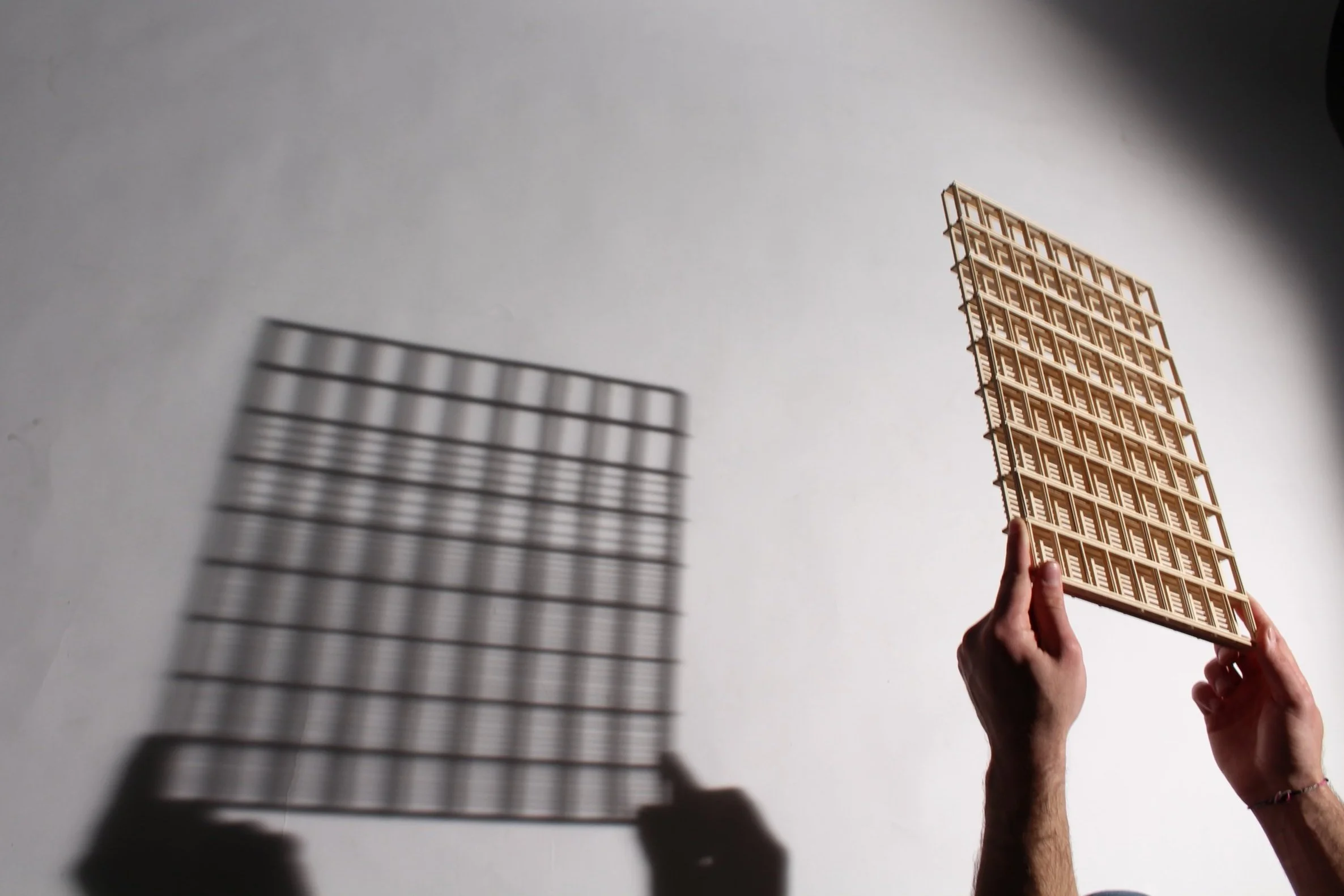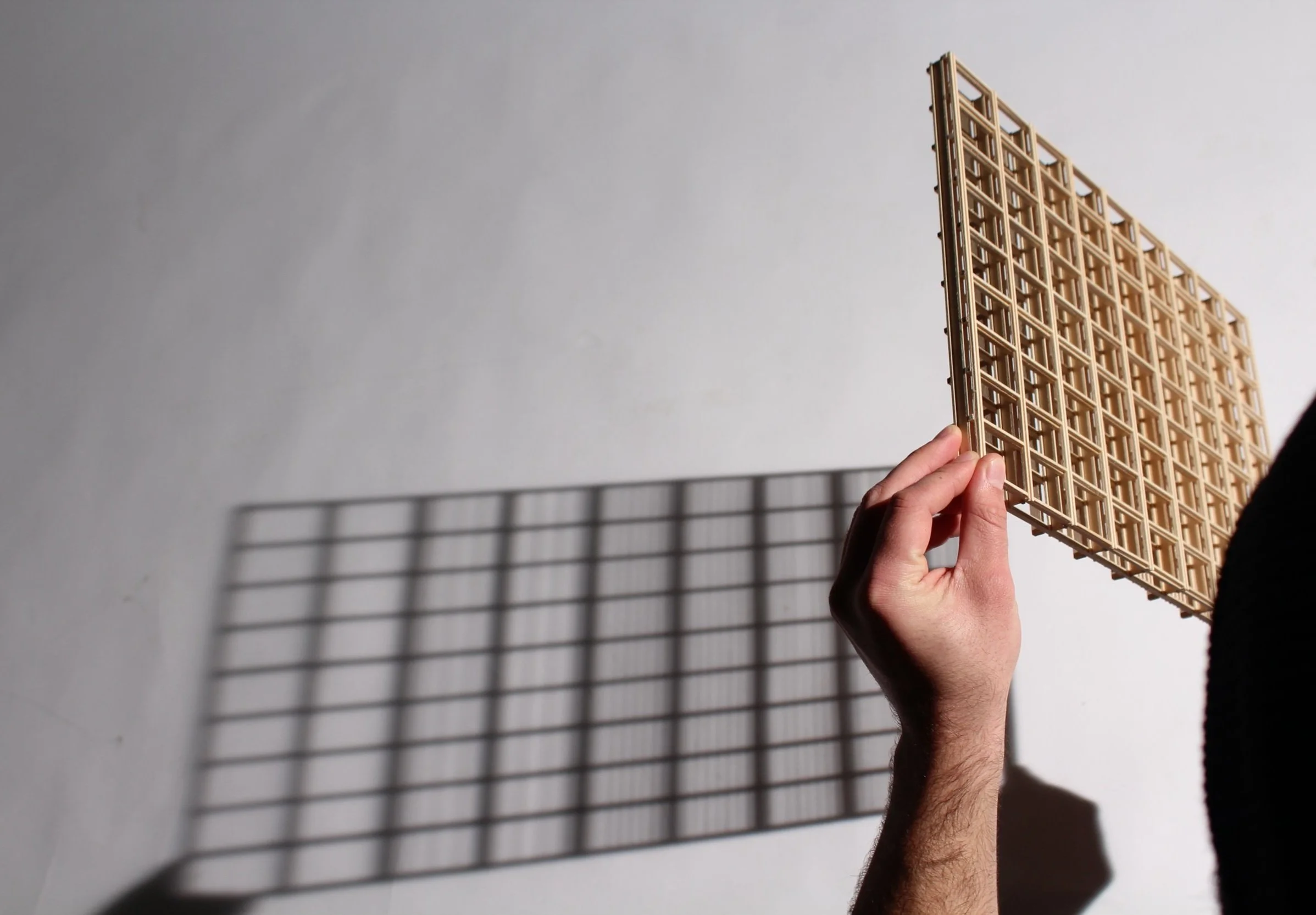 The louvers come into play to control the atmosphere and lighting. They can diffuse the light when desired, or be opened to allow the streaks of light to shine through. This would be most beneficial to a painter who would not want direct sunlight on their work, especially while they were painting, but would allow that same person to appreciate the other aspects of light allowed into their home. This way they have complete control over the consistency of light desired. I built a scale model of the roofing system to test various louver spacing and light filtration. The grid of the skylight system was then used to inform the modular system of the house layout. By bringing in natural light from the roof system and clearstory windows allows for space on the walls to be used as creative work space without distraction and control of the light can be adjusted to the needs of the work and comfort of the artist.
