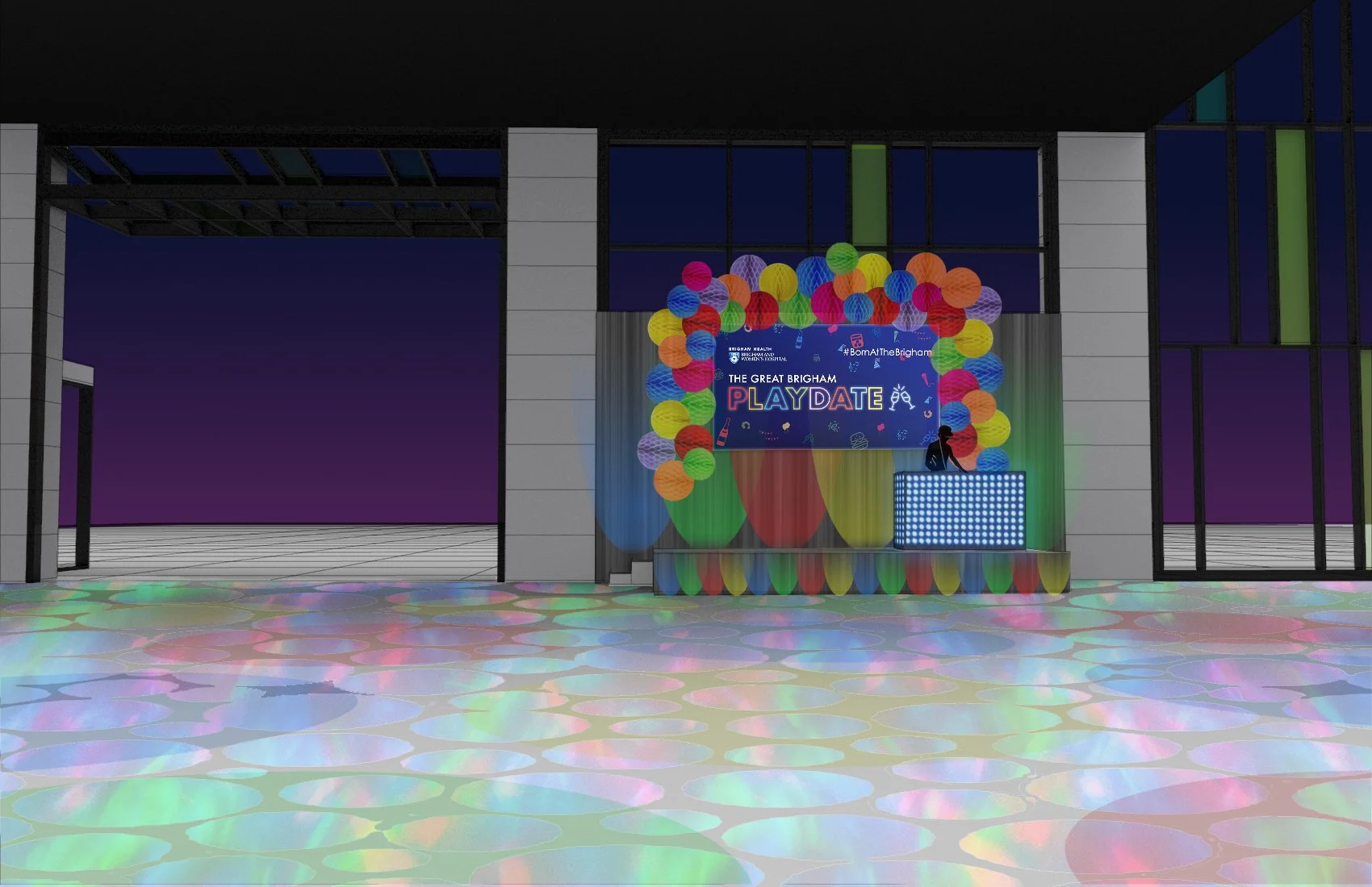 Through collaboration with the event designer, renderings of the Playdate experience were used to pitch the concept of the evening’s atmosphere and decoration to the fundraiser organizers and venue. In order to get the scale and space to feel right, I modeled the interior space of the Boston Children’s Museum and main staging elements in Rhino and applied additional layering details in Photoshop. Playful colors and textures were used to invite the audience in childlike play.